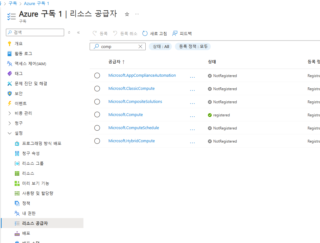 Microsoft.Compute 공급자를 구독에 등록해주면 정상적으로 할당이 되며 AKS가 생성된다.
