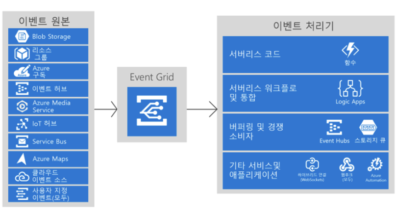 이벤트들은 Event Grid에서 Azure 서비스나 엔드포인트 같은 곳으로 전달되며 이러한 원본은 Azure나 다른 서비스일 수 있다.