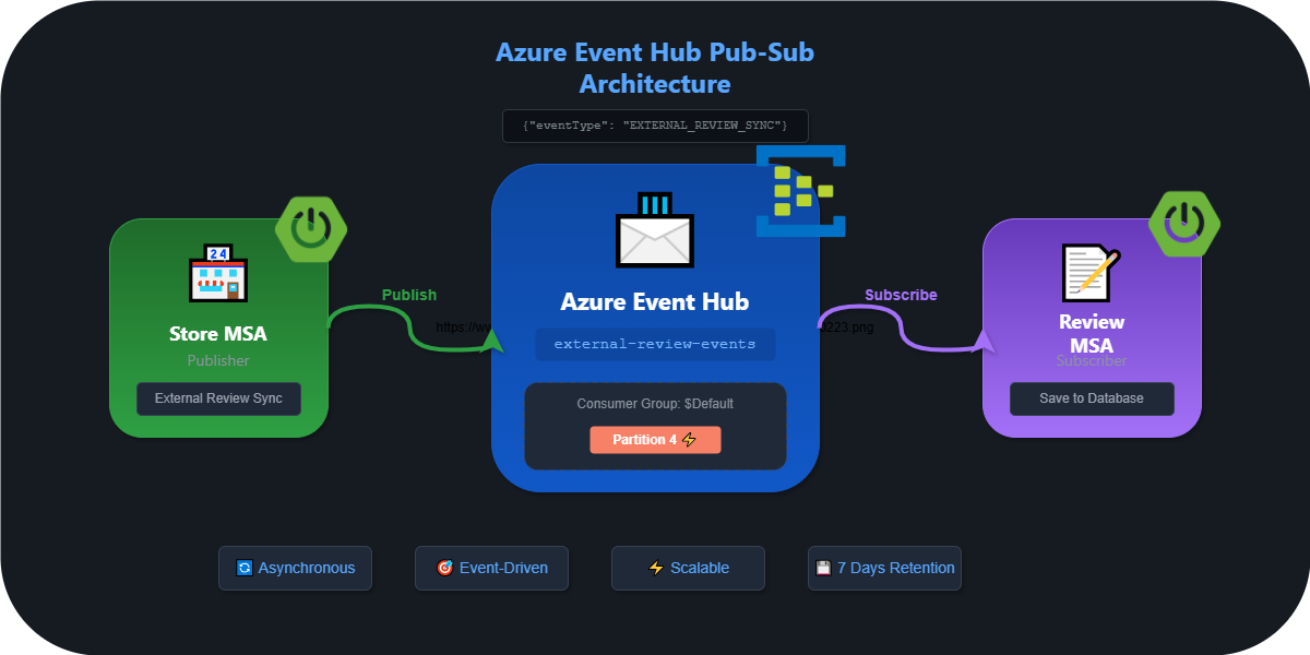 Store와 Review는 Spring Boot기반 컨테이너 환경에서 MSA로 구현되어 있습니다. Store는 외부 가게 리뷰(카카오맵)에서 데이터를 크롤링하여 가져옵니다. 이를 Review는 자신의 review 데이터베이스에 저장을 해야합니다. 이 사이에서 Azure Event Hub를 사용해 Pub-Sub 패턴을 컨테이너 기반 Spring Boot에서 어떻게 구현하는지 알아보겠습니다.