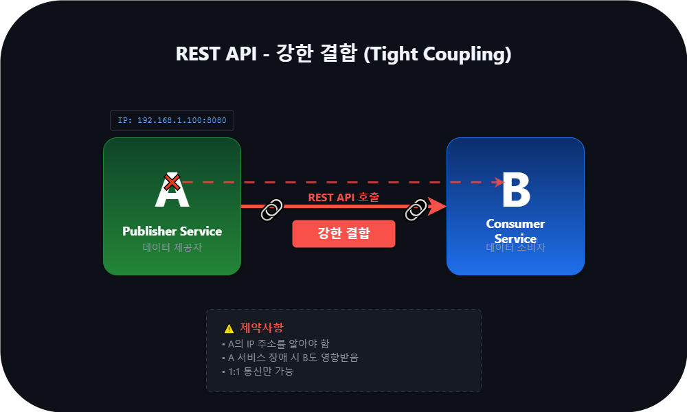 A라는 publisher 서비스와 B라는 Consumer라고 가정하겠습니다. B서비스는 A서비스에게 요청하기 위해서는 아래와 같은 제약사항이 존재합니다.
