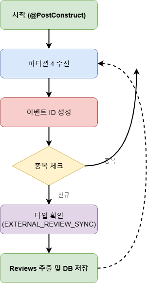 Spring Boot 시작시에 자동으로 리스너가 시작할 수 있게 합니다. (@PostConstruct) listenToExternalReviewEvents에서 리스너 로직이 담겨있습니다.