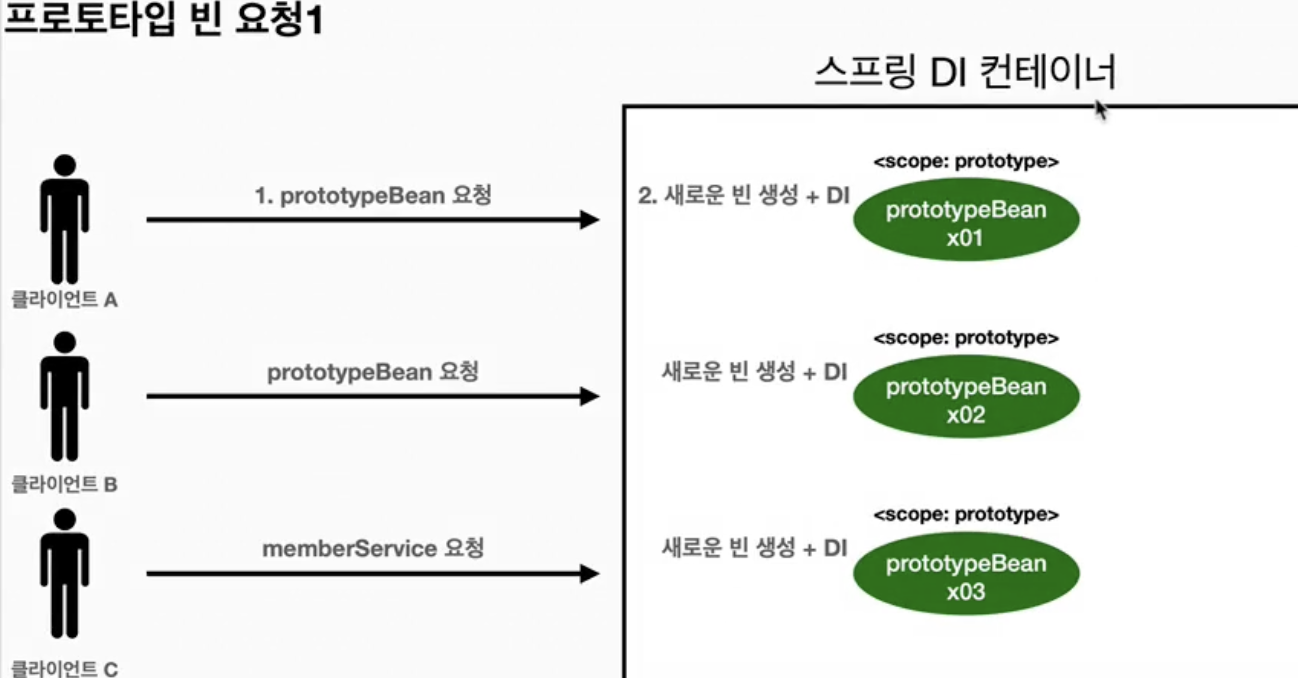 - 프로토 타입 : 스프링 컨테이너가 생성과 의존관계 주입까지만 관여한다. 추후에는 관리하지 않는다.