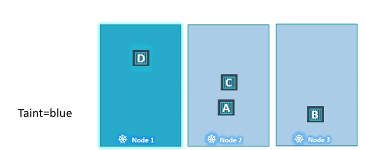 kube-scheduler는 Key=blue 가 아닌 Pod은 Node1에 할당하지 않고 tolerations가 blue인 Pod D만 Node1에 할당 한 것을 볼 수 있다.