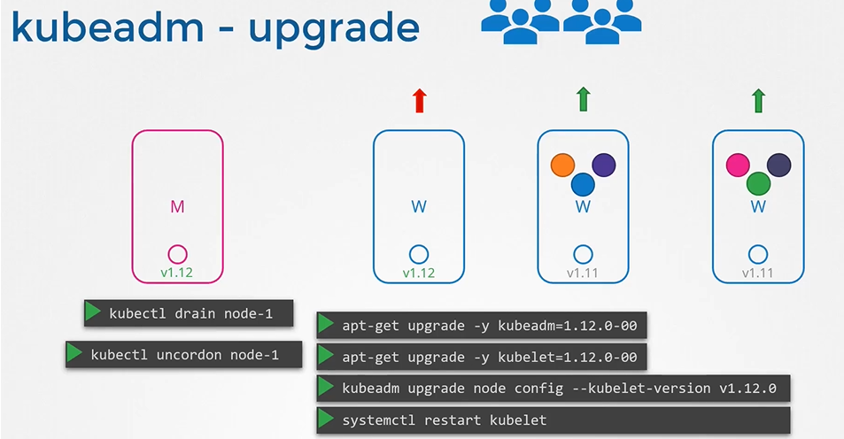 이를 바탕으로 worker node를 업그레이드 하는 방식에는 하나의 Node를 drain시키고 kubeadm과 kubelet을 업그레이드 하는 방식이 주로 사용된다.