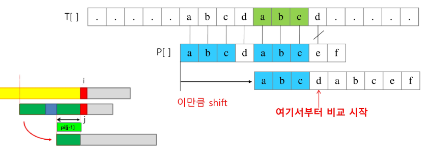 - 불일치가 발생한 텍스트 문자열의 앞 부분에 어떤 문자가 있는지를 미리 알고 있으므로, 불일치가 발생한 앞 부분에 대하여 다시 비교하지 않고 매칭을 수행
